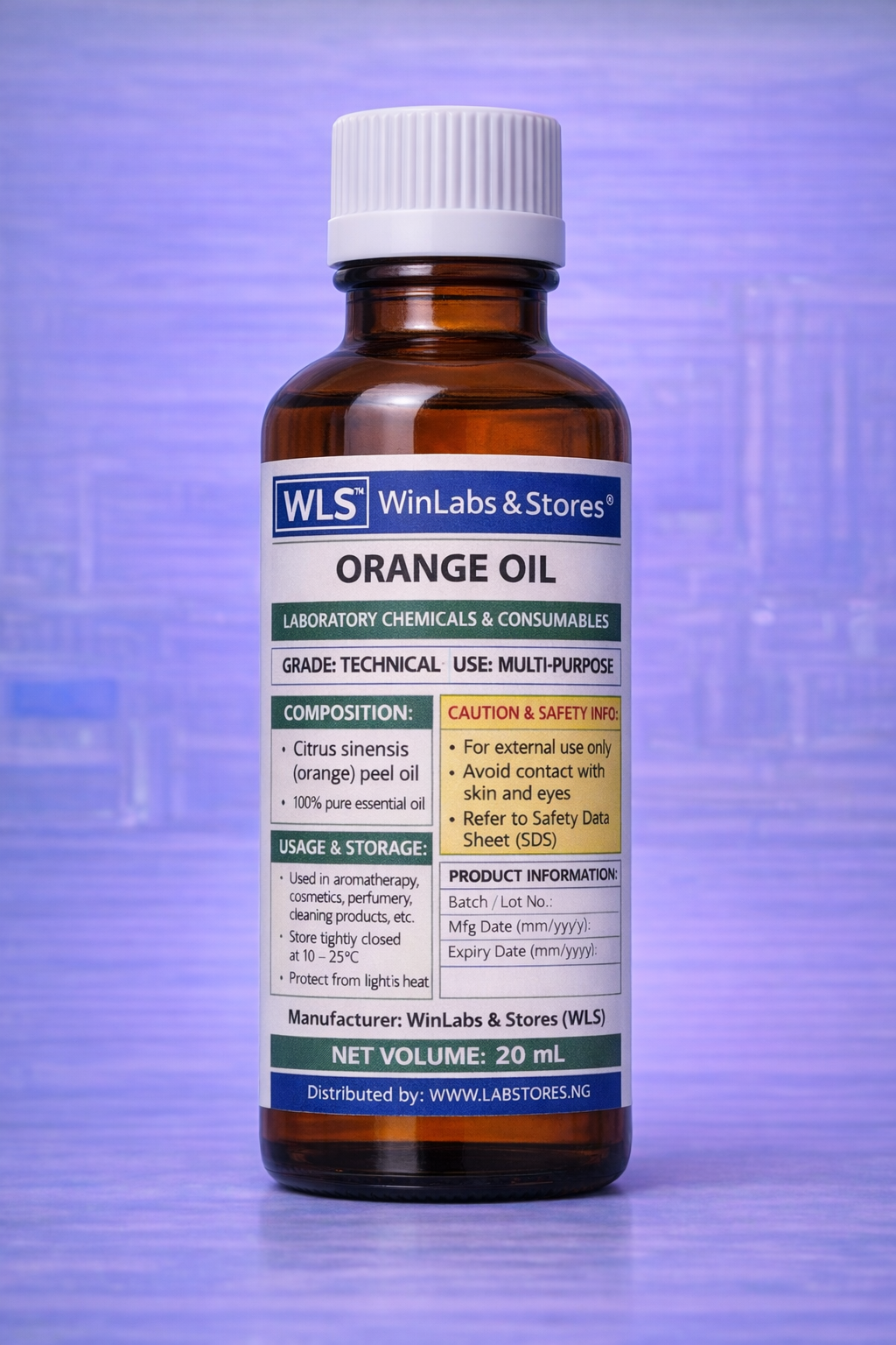 WLSâ„¢ Orange Oil is a 100% pure essential oil derived from the peel of Citrus sinensis. Known for its fresh, sweet citrus aroma, this oil is widely used in cosmetic formulations, aromatic applications, fragrance development, and product research. Carefully packaged in an amber glass bottle to preserve quality and stability.
